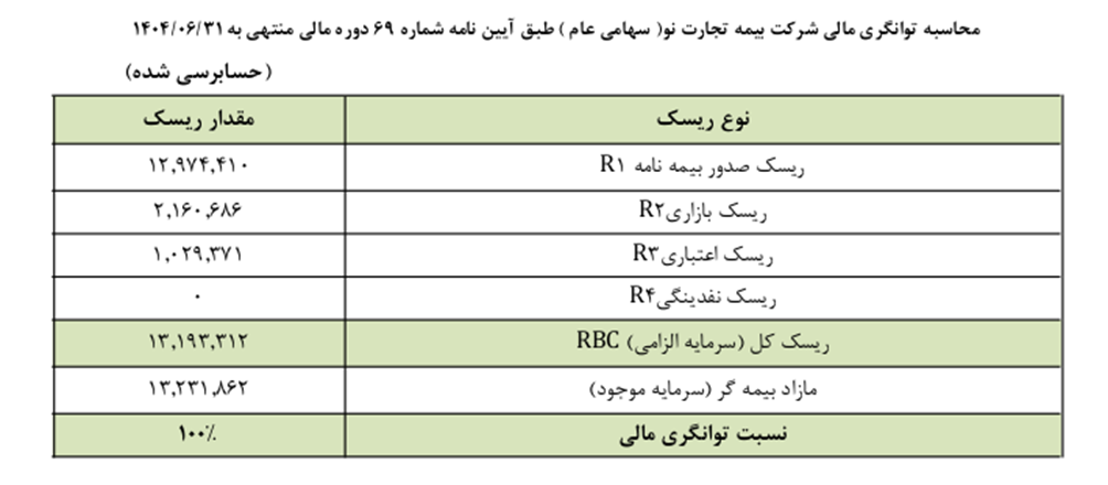 حقیقت این است که بر اساس گزارش توانگری مالی و با توجه به قرار گرفتن نسبت توانگری شرکت در سطح یک، بیمه تجارت نو در شریط عادی در حال حاضر نیازی به تأمین سرمایه جدید یا کاهش ریسکهای پذیرفتهشده ندارد. یعنی ریسک شرکت از بین رفته و شرایط شرکت ثابت و پایدار است و کمیته مدیریت ریسک شرکت، ساختار ریسکها و تناسب آن با سرمایه را بهطور منظم و حداقل هر شش ماه یکبار بررسی میکند.